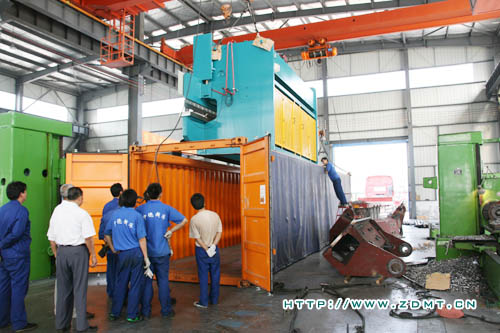 這套大型機床主機由兩臺250噸6米的數(shù)控板料折彎機組成,可實現(xiàn)單機及雙機聯(lián)動工作的功能,極大的方便了大型生產(chǎn)中的多元化要求。機器總重達50余噸,可完成12米的工件,對裝箱的操作技術要求很高,但由于我們機械化的車間及熟練的技術人員,裝箱過程雖然繁瑣但并不費力。由于整機超高超長,采用的是兩個開頂箱,將兩臺主機分開來裝。考慮到機器要在海上航行近一個月,裝箱的工作人員做足了防護措施:底部鋼條固定,兩側(cè)鐵絲固定,外加透明塑料膜,頂部自制框架固定并套上雨布等等,以免在運輸過程中造成對機器不必要的損壞。