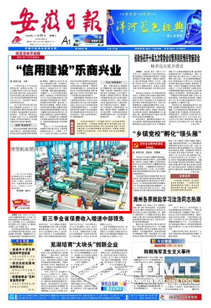 今日(2009年11月11日)《安徽日報(bào)》頭版刊載《博望機(jī)床銷四方》的圖片新聞報(bào)道。在我公司大型車間圖片中,配出如下文字報(bào)道:11月6日,位于當(dāng)涂縣博望鎮(zhèn)的民營企業(yè)安徽中德機(jī)床股份有限公司生產(chǎn)車間里一片繁忙。該企業(yè)今年前三季度銷售量同比增長35%,產(chǎn)品出口30多個(gè)國家和地區(qū)。(特約攝影 謝富樂)